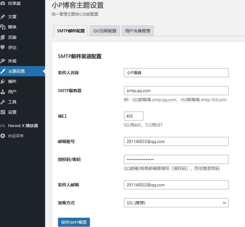 因为写了前端用户中心,所有用户不能进入后台,只能默认进去我的前端用户中心。这个smtp功能就是给前端用户中心的邮箱地址发送邮件功能的,包括注册邮件,评论审核邮件,密码修改邮件。